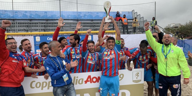 ALGHERO - Fantasia, acrobazie, spettacolo, sudore e fatica, questi gli ingredienti che hanno caratterizzato la Coppa Italia Aon 2019 sublimata da una finale emozionante, imprevedibile ed indimenticabile. Sul rettangolo di sabbia della Beach arena di Alghero il Catania ha conquistato la sua seconda coccarda tricolore consecutiva, la quarta dopo quelle del 2004, 2005 e 2018, quest’ultima sempre sul Terracina. Per il club dell’elefantino è il decimo trofeo nel circuito ufficiale, ora è il sodalizio più titolato in Italia. Avrebbe meritato il successo anche il Terracina, che si è dovuto arrendere per 3-5 all’extra-time dopo aver subito la rimonta dei siciliani.