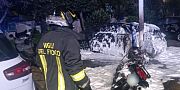 L´incendio divampato su uno scooter ha interessato immediatamente gli altri mezzi parcheggiati vicini. Provvidenziale l´intervento dei vigili del fuoco. Sul posto i carabinieri: indagini