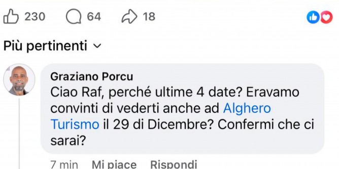 ALGHERO – «A cosa stiamo assistendo?» È la domanda che Fratelli d’Italia rivolge all’Amministrazione comunale dopo il messaggio apparso sui social, in cui il presidente della Fondazione Alghero, Graziano Porcu, chiede pubblicamente a Raf se sarà presente il 29 dicembre ad Alghero. «Ciao Raf, perché ultime 4 date? Eravamo convinti di vederti anche ad Alghero il 29 di Dicembre? Confermi che ci sarai?» si legge nel commento di Porcu sul profilo ufficiale del cantante.