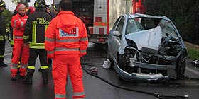 Una Matiz con a bordo tre giovani contro un fuoristrada. Ferite tre persone, trasportate dŽurgenza al Pronto soccorso cittadino. LŽintervento di Carabinieri e Vigili del Fuoco