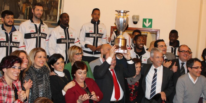 SASSARI – «Sono contento e onorato della vostra visita. La città vive con voi momenti di gloria a livello nazionale e internazionale». Sono le parole del sindaco di Sassari Nicola Sanna che questa sera, nella sala consiliare, assieme alla giunta e all'intero consiglio comunale, ha ricevuto i campioni della Dinamo Sassari, accompagnati dal presidente Stefano Sardara e dal coach Meo Sacchetti. Con loro l'amministrazione sassarese ha voluto festeggiare l'ultimo trofeo conquistato di recente: la Coppa Italia